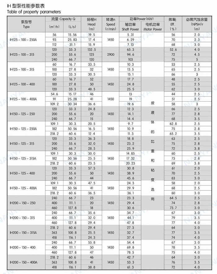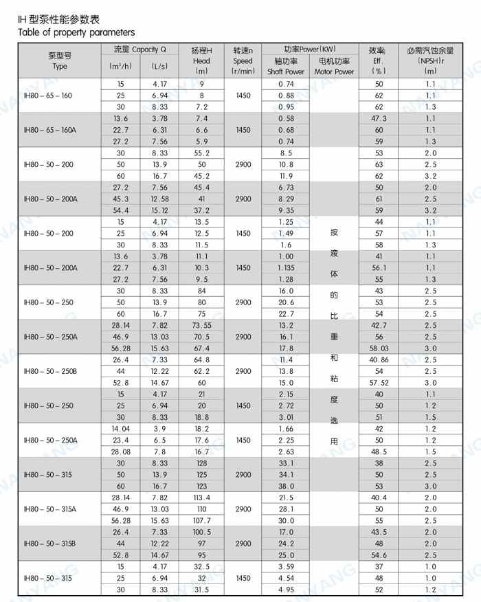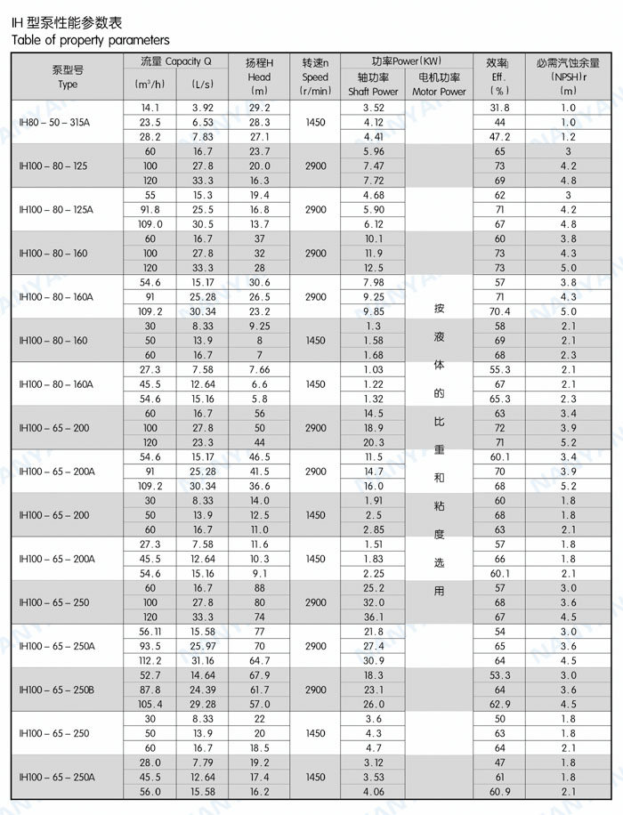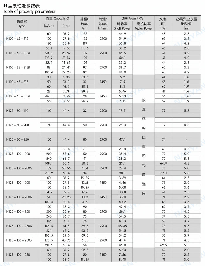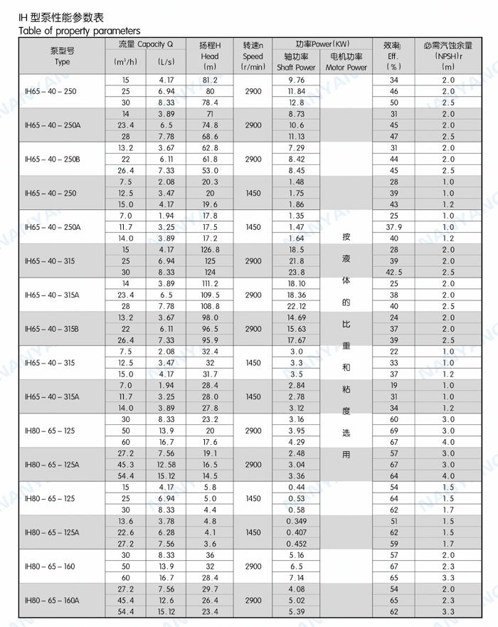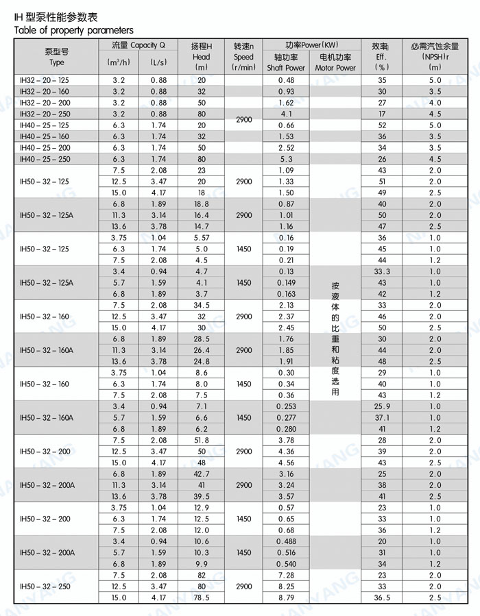 结构特点:IH系列泵为脚支撑,可以承受来自外界载荷直接传给基础。轴承润滑方式为稀油润滑,由恒位油杯控制油位,充分保证轴承在良好润滑状态下工作,使轴承具有最佳使用寿命。叶轮为闭式叶轮,由背叶片或平衡孔平衡轴向力,残余轴向力由轴承平衡。轴封根据使用情况的不同,可采用动力密封、单端面机械密封、双端面机械密封、串联式机械密封,可以采用内冲洗、自冲洗、外冲洗对机械密封进行冲洗和冷却。轴承深沟球轴承、圆柱滚子轴承和角接触球轴承,分别配有轻轴和重轴,以满足不同载荷的需要。IH系列40多种泵只需6种轴承架,通用性强标准化程度高,且结构紧凑合理,外观质量好。泵的联轴器为爪型、柱销型、膜片型等供用户选择。膜片可分装式,维修时无须拆卸管路和电机,可自由拆卸轴承架、轴、密封箱体、叶轮组件等。泵的入口法兰水平吸入,出口法兰垂直向上。从电机端看,泵轴顺时针旋转。